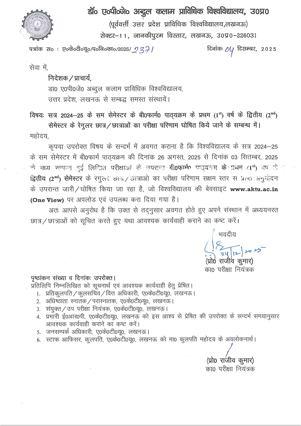AKTU ने ये रिजल्ट एक ऑफिशियल सर्कुलर (पत्रांक: AKTU/PN/Ka/2025/2371, दिनांक: 4 दिसंबर 2025) के जरिए सभी संबद्ध संस्थानों को भेजा है। इसमें प्राचार्य/निदेशकों को निर्देश है कि स्टूडेंट्स को सूचित करें और जरूरी एक्शन लें। फुल डिटेल्स के लिए ऑफिशियल PDF डाउनलोड करें: http://fms.aktu.ac.in/Resources/Attachments/Circular/2092975ws2tw3g.pdf। ये डॉक्यूमेंट प्रो. राजीव कुमार (का. परीक्षा नियंत्रक) द्वारा साइन है, और इसमें वीसी/रजिस्ट्रार को कॉपी भी भेजी गई है।