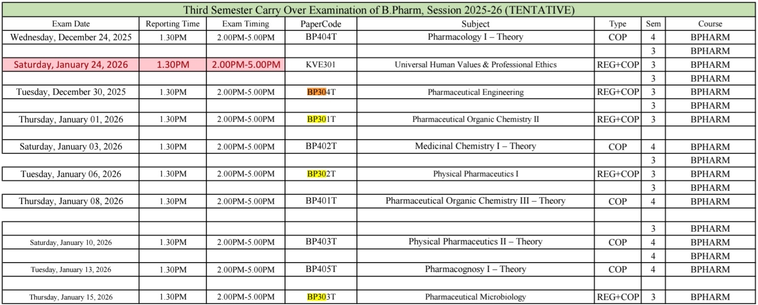 | Tuesday, December 30, 2025 | 1.30PM | 2.00PM-5.00PM | BP304T | Pharmaceutical Engineering | REG+COP | 3 | BPHARM |