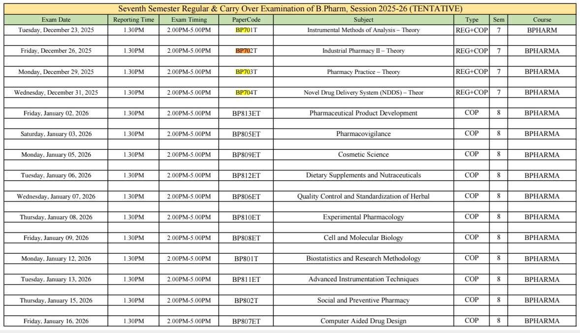 | Friday, December 26, 2025 | 1.30PM | 2.00PM-5.00PM | BP702T | Industrial Pharmacy II – Theory | REG+COP | 7 | BPHARMA |