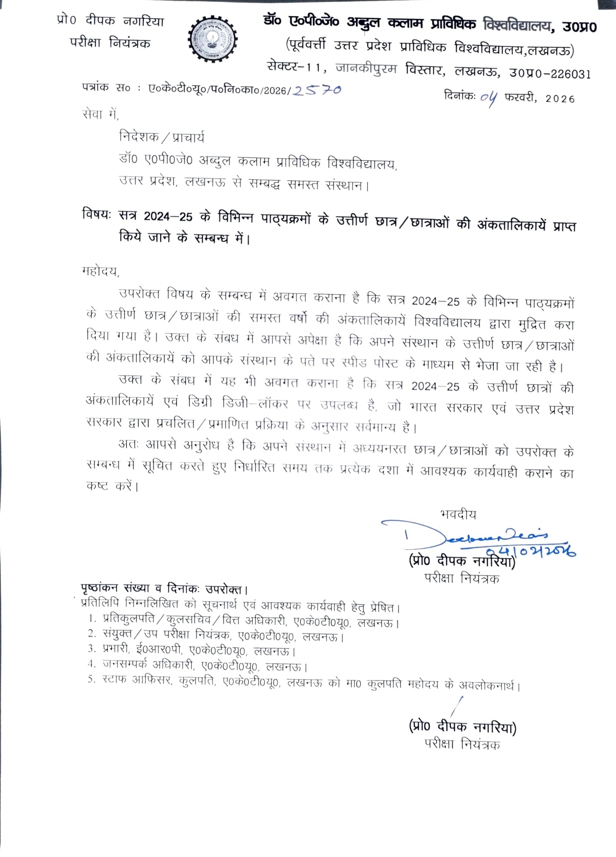 स्टूडेंट्स, AKTU ने 05 फरवरी 2026 को एक नया नोटिस जारी किया है—सत्र 2024-25 के पास हुए लड़के-लड़कियों की मार्कशीट्स अब तैयार हैं। PDF में क्लियर लिखा है कि ये अंकतालिकाएं इंस्टीट्यूट्स को स्पीड पोस्ट से भेजी जा रही हैं, और डिग्री भी DigiLocker पर अपलोड हो गई है। अगर तुम जॉब अप्लाई करने या फ्यूचर स्टडीज का प्लान कर रहे हो, तो ये अपडेट मिस मत करना। मैंने नोटिस चेक किया, और Quora पर स्टूडेंट्स डिस्कस कर रहे कि “DigiLocker से मार्कशीट डाउनलोड करके तुरंत यूज कर सकते हो, पेपर वर्शन वेट करने से बेहतर”। Reddit के r/AKTU सबरेडिट में भी यूजर्स शेयर करते हैं कि ऐसे नोटिस से टाइमली इन्फो मिलती है, रियल हेल्पफुल। चलो, डिटेल्स देखते हैं और एक्शन कैसे लो!
