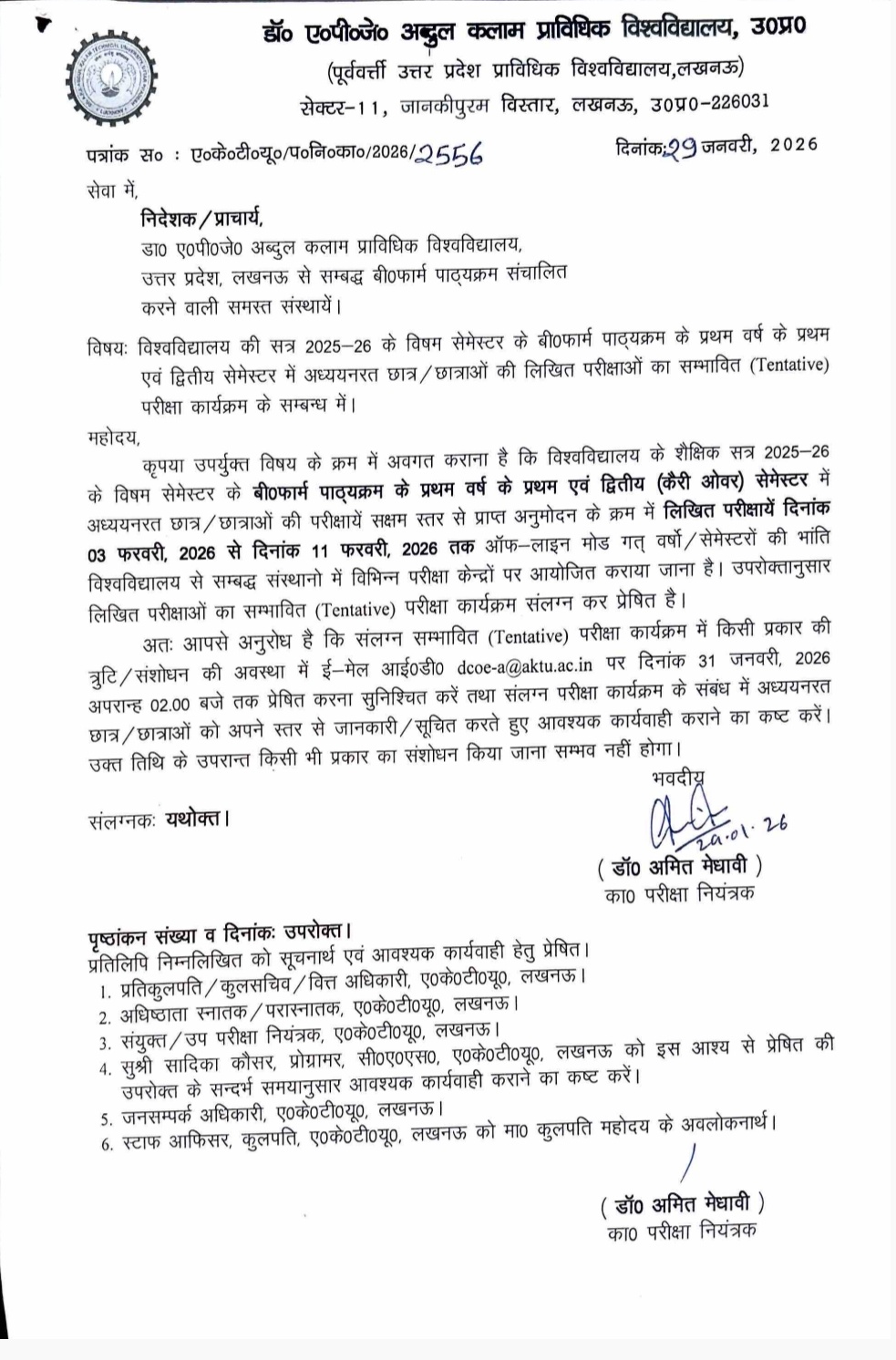 AKTU ने ये सर्कुलर सभी B.Pharm कोर्स चलाने वाले अफिलिएटेड इंस्टीट्यूट्स को भेजा है, जिसमें एग्जाम कंट्रोलर ने निर्देश दिए कि स्टूडेंट्स को इंफॉर्म करो और सुजेस्चंस कलेक्ट करो। मेन पॉइंट: एग्जाम्स ऑफलाइन होंगे, और शेड्यूल टेंटेटिव है – अप्रूवल के बाद फाइनल होगा।