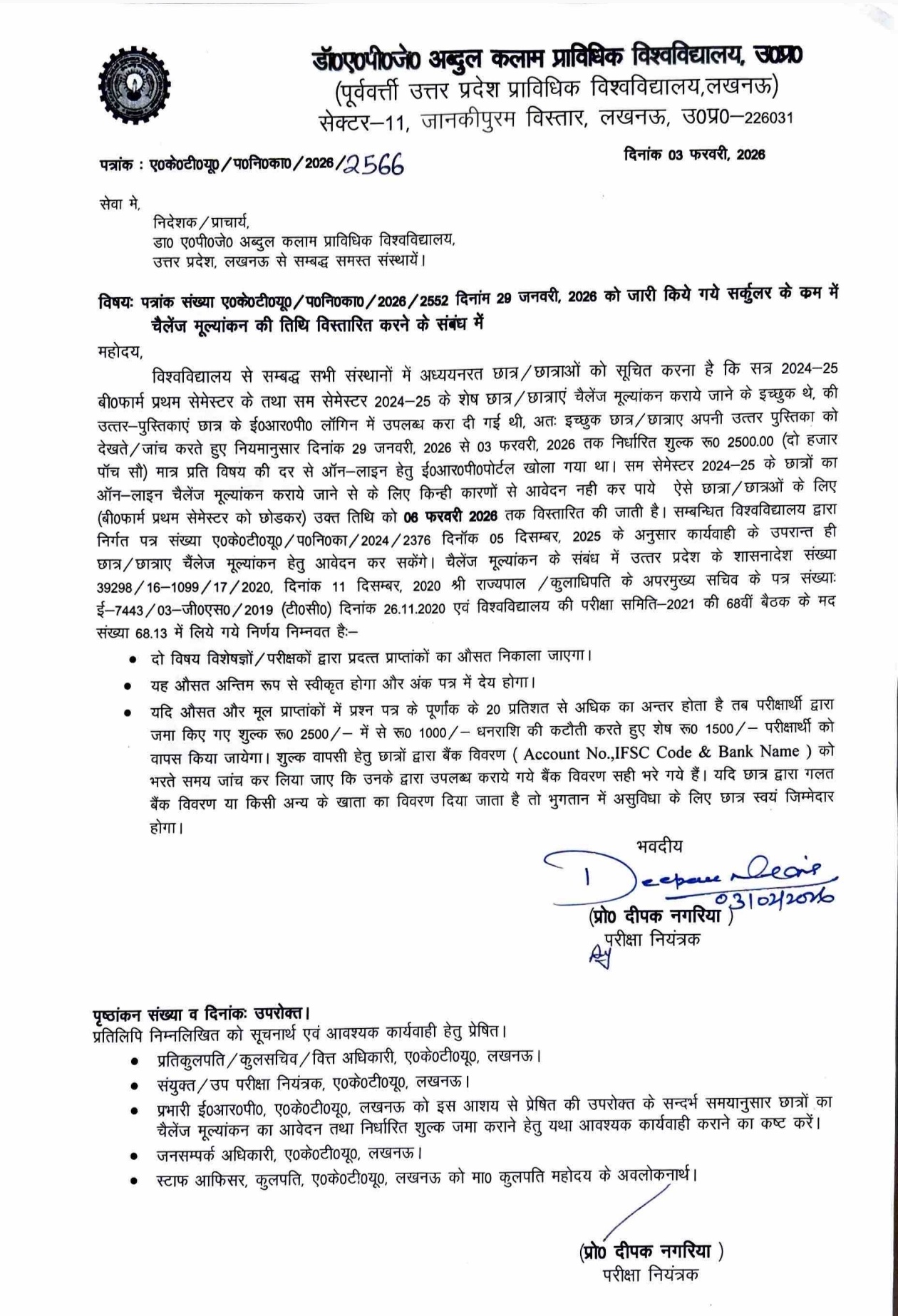 दोस्तों, चैलेंज इवैल्यूएशन मतलब तुम्हारी आंसर बुक्स को दो नए एक्सपर्ट्स चेक करेंगे, और उनके मार्क्स का एवरेज फाइनल होगा। PDF सर्कुलर में प्रो. दीपक नगरिया ने साइन किया है, जो कहता है कि पिछले सर्कुलर की डेट 29 जनवरी से 3 फरवरी तक थी, लेकिन कुछ स्टूडेंट्स किसी वजह से अप्लाई नहीं कर पाए, तो अब ओड सेम वालों के लिए 6 फरवरी तक एक्सटेंड। B.Pharm 1st सेम वालों के लिए नहीं, वो पहले वाली डेट पर ही। ये UP गवर्नमेंट 2020 ऑर्डर और AKTU 2021 मीटिंग पर बेस्ड है।