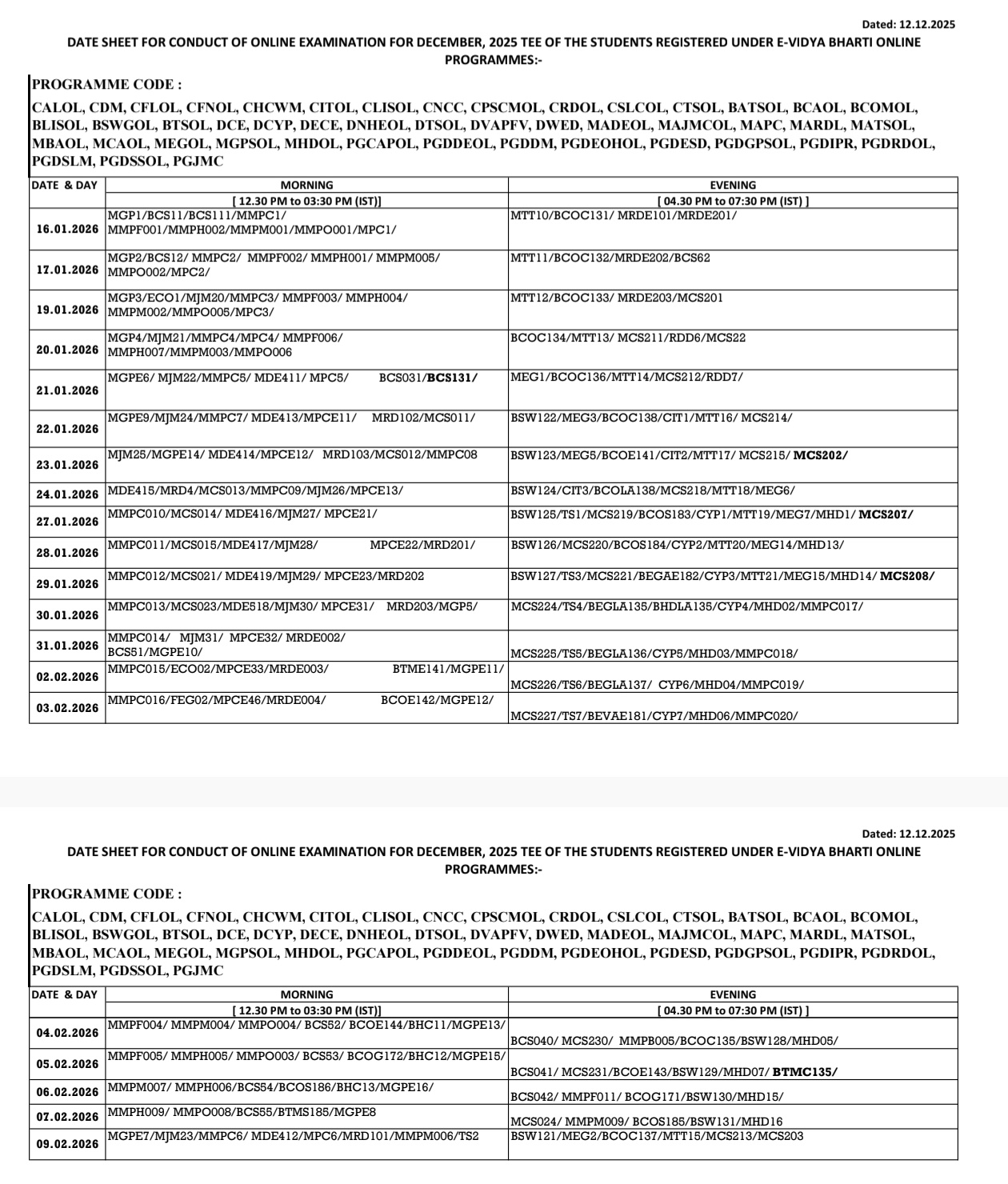 | 29.01.2026 | गुरुवार | MMPC-012 (Human Resource Management), BEGLA-137 (English-III), MHD-014 (Educational Technology) | – |
