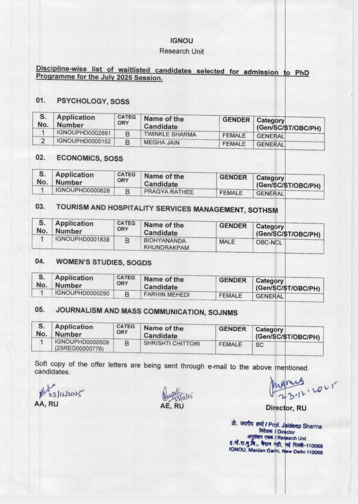 | साइकोलॉजी (SOSS) | ट्विंकल शर्मा (IGNOUPHD0002691), मेघा जैन (IGNOUPHD0000152) | जनरल (फीमेल) |