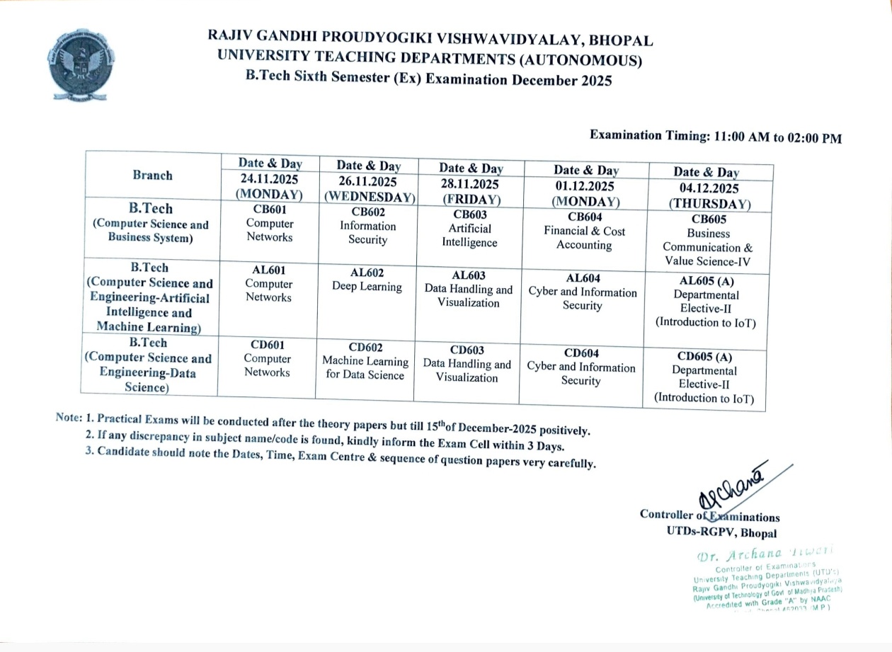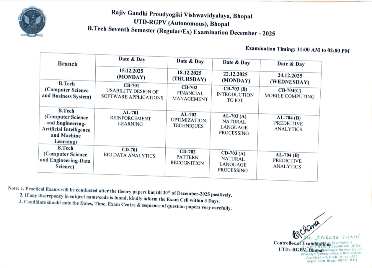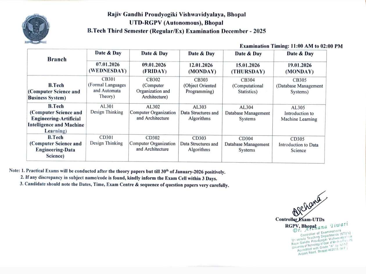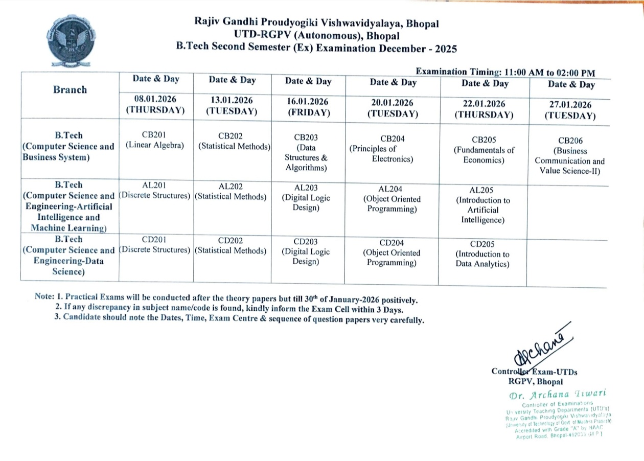 अगर आप राजीव गांधी प्रौद्योगिकी विश्वविद्यालय (RGPV), भोपाल के BTech फर्स्ट सेमेस्टर में हैं और दिसंबर 2025 एग्जाम्स की डेट्स का इंतजार करते हुए प्रिपरेशन में कन्फ्यूजन हो रहा है, तो अलर्ट—टाइमटेबल जारी हो चुका है, और 16 जनवरी 2026 से थ्योरी पेपर्स शुरू! UTD-RGPV (ऑटोनॉमस, NAAC A ग्रेड) ने रेगुलर और एग्जीक्यूटिव मोड के लिए डिटेल्ड शेड्यूल रिलीज किया है, जिसमें इंजीनियरिंग केमिस्ट्री, मैथ्स-I, फिजिक्स जैसे कोर सब्जेक्ट्स कवर हैं। प्रैक्टिकल एग्जाम्स थ्योरी के बाद फरवरी तक चलेंगे, तो अगर बैकलॉग क्लियर करने वाले हैं या फ्रेशर हैं, तो अभी लास्ट ईयर पेपर्स सॉल्व करें—वरना सेशन 2025-26 में प्रमोशन डिले हो सकता है। आइए, इस टाइमटेबल की हर डिटेल समझें, ताकि आपकी BTech जर्नी स्ट्रॉन्ग स्टार्ट हो, खासकर NEP 2020 के होलिस्टिक इंजीनियरिंग फोकस वाले सब्जेक्ट्स पर।