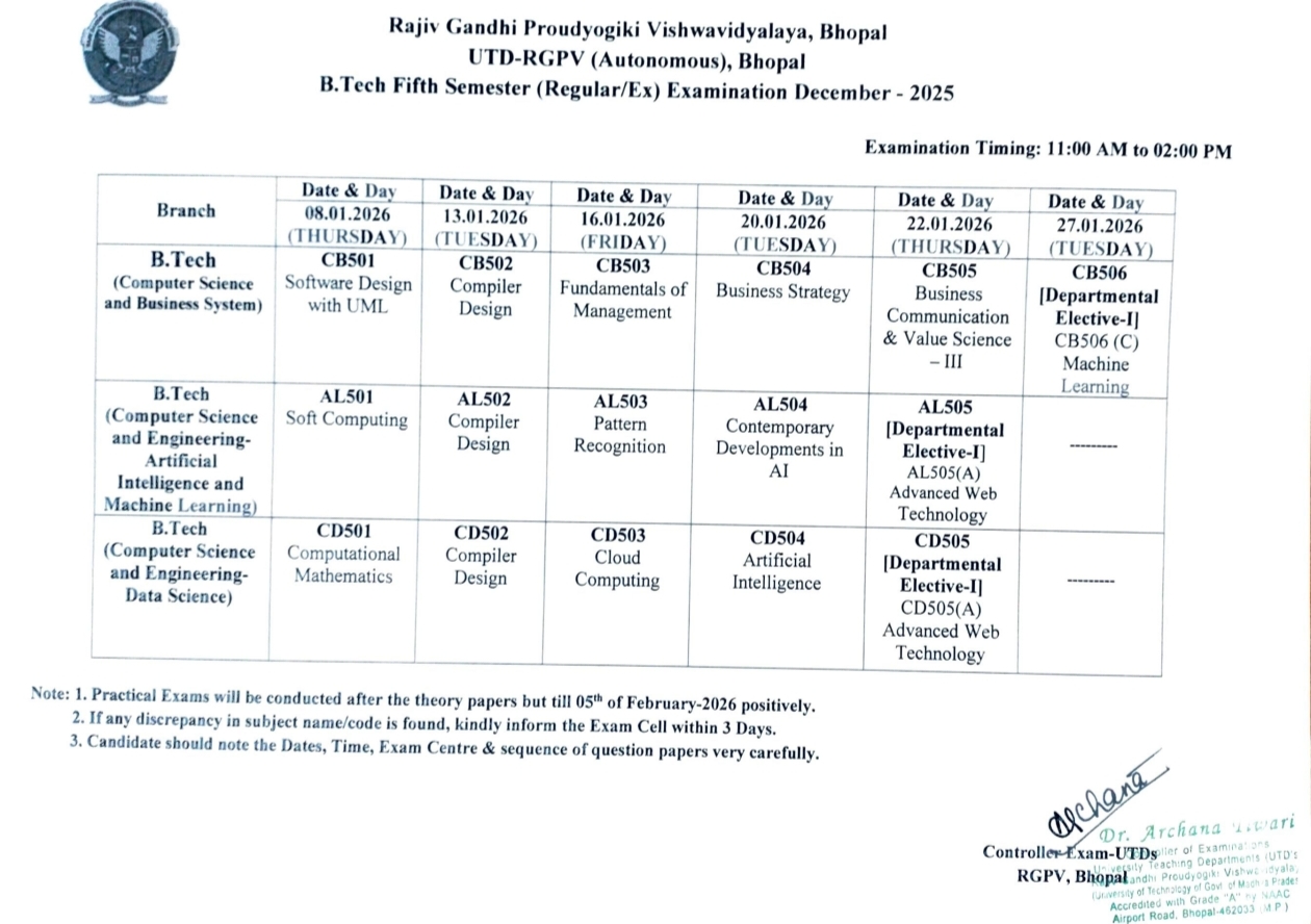 यह शेड्यूल दिसंबर 2025 एग्जाम्स के लिए जनवरी 2026 में सेट है—सभी थ्योरी एग्जाम्स सुबह 11:00 AM से दोपहर 2:00 PM तक। RGPV के यूनिवर्सिटी टीचिंग डिपार्टमेंट (UTD), भोपाल ने इसे जारी किया, जो BTech फर्स्ट सेमेस्टर (रेगुलर/एग्जीक्यूटिव) को कवर करता है। सब्जेक्ट्स कॉमन हैं सभी ब्रांचेस (CSE, ME, CE, EE आदि) के लिए, जैसे बेसिक इलेक्ट्रिकल इंजीनियरिंग और कम्प्यूटर प्रोग्रामिंग। प्रैक्टिकल्स 7 फरवरी 2026 तक।